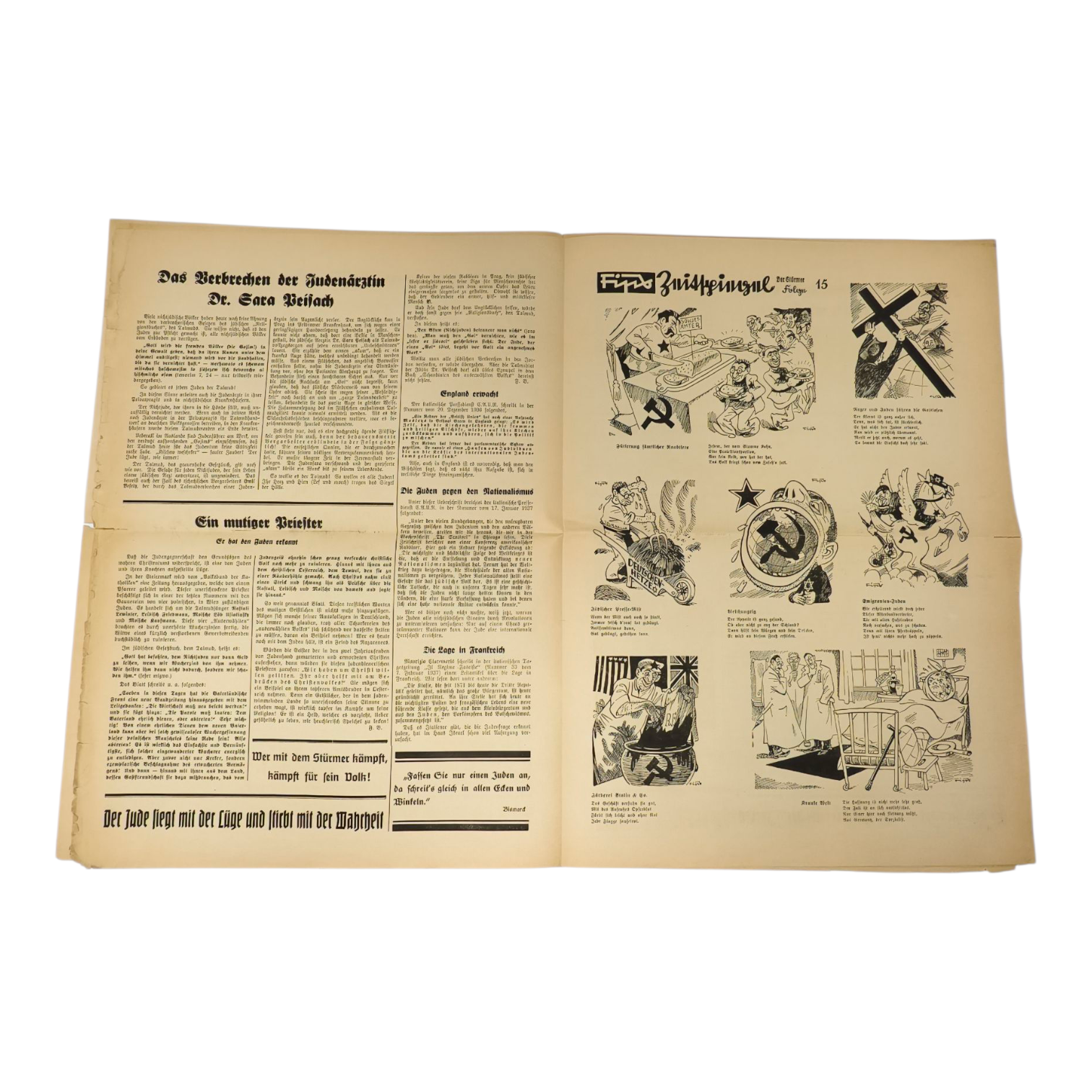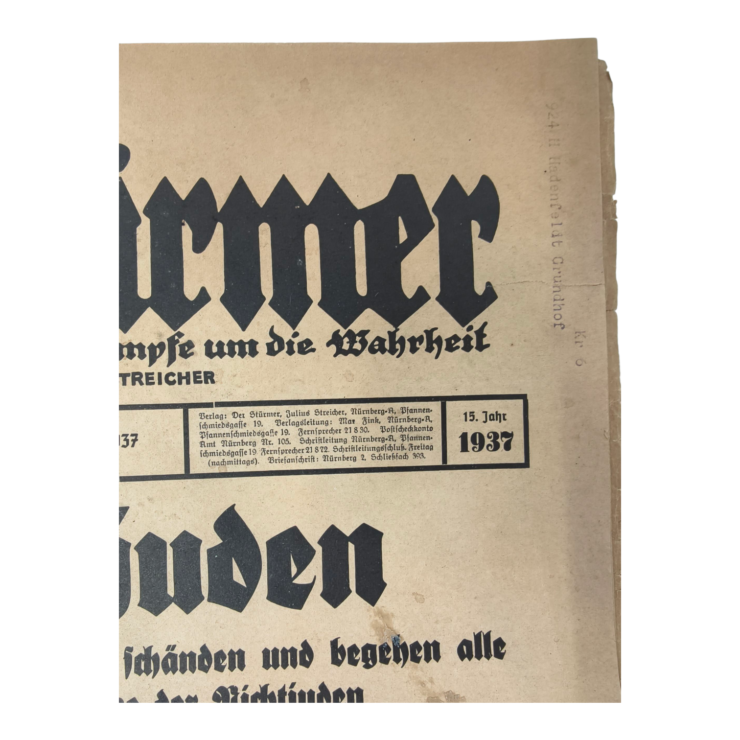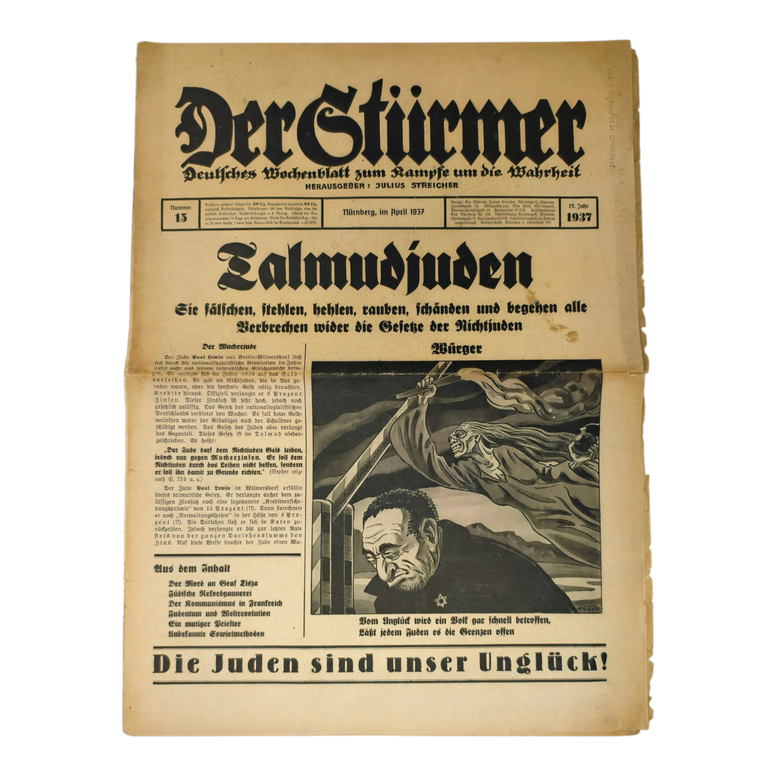 Issue of race-baiter Julius Streicher's anti-Semitic newspaper, Der Sturmer - 1937 Number 15. Some separation at the folds.