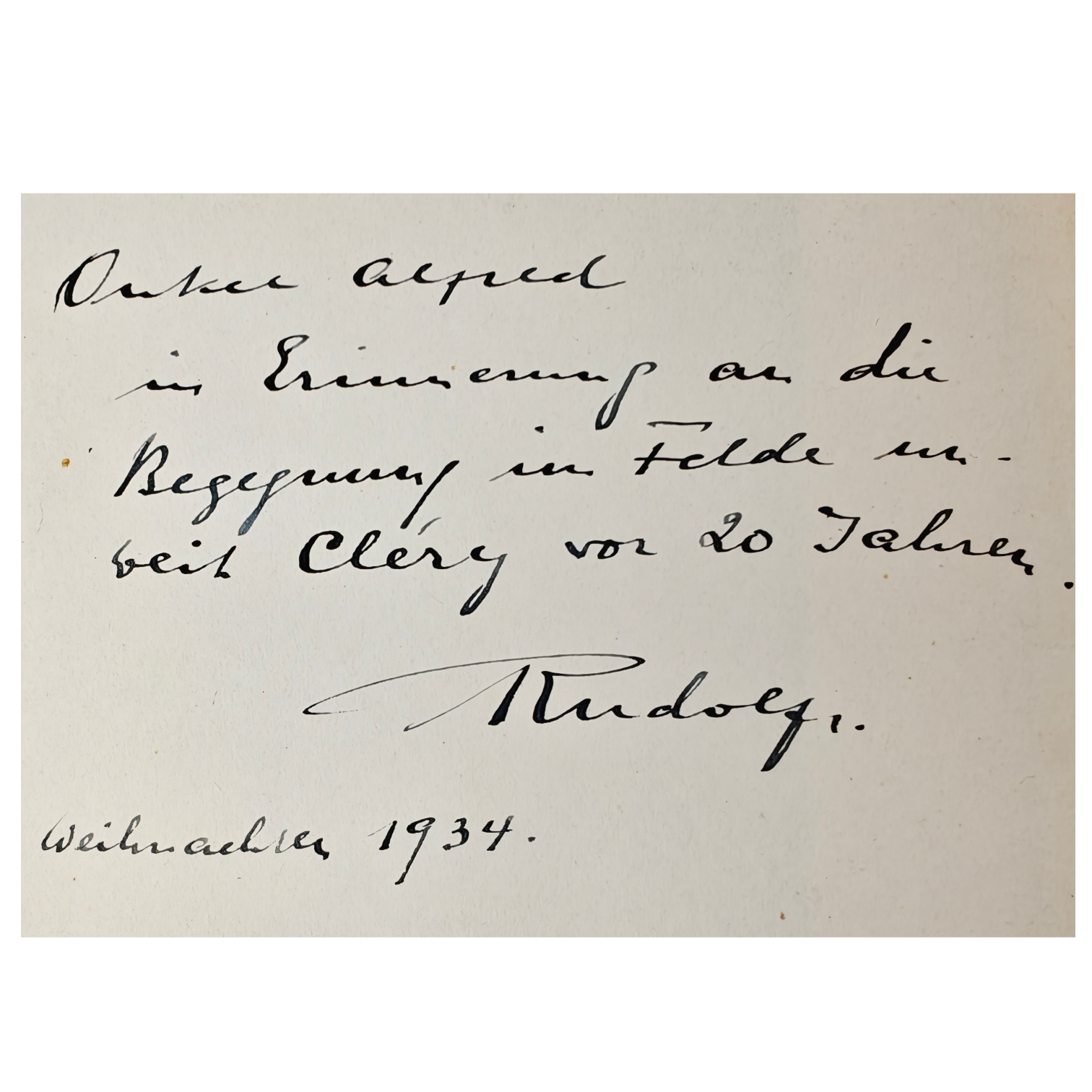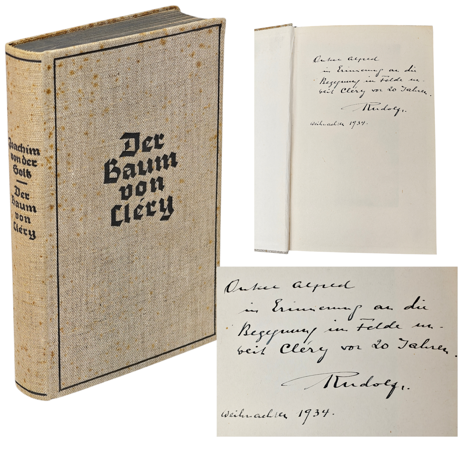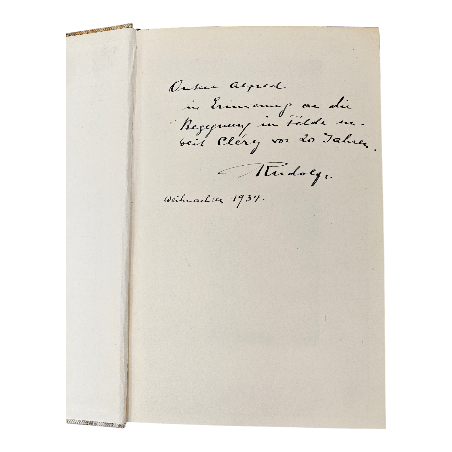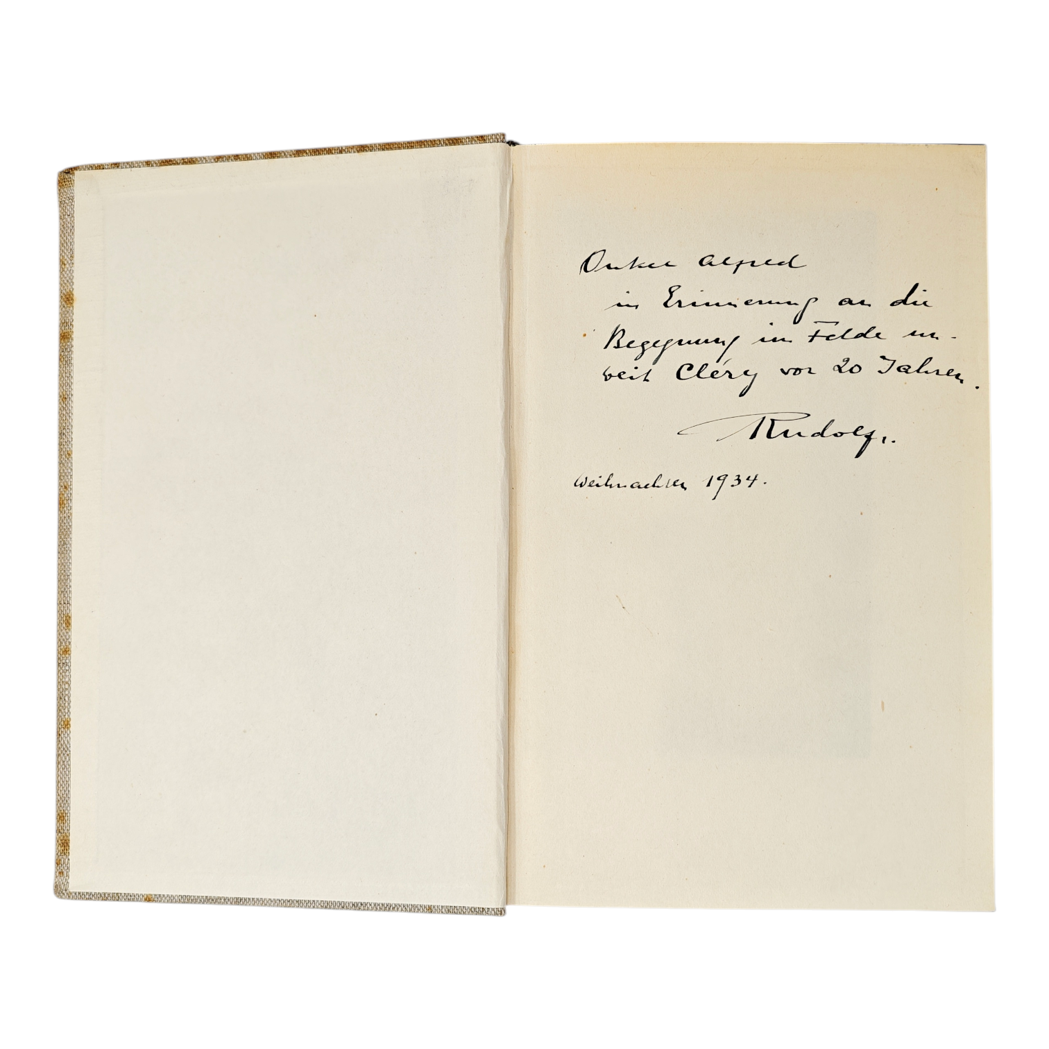 Rudolf Hess Signed and Dedicated Book to a fellow WWI soldier. He writes "In remembrance of the encounter in the field near Cléry twenty years ago.
