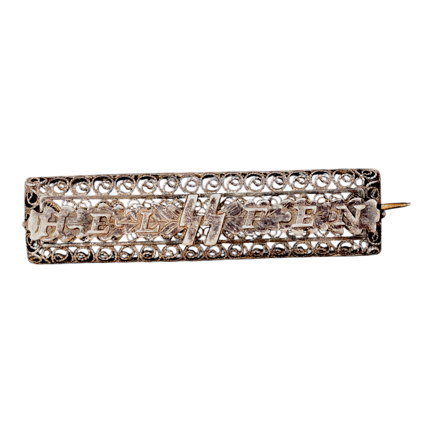 This silver women's SS Helfen brooch from the Second World War is a distinctive and refined piece, featuring an original SS Helfen badge mounted onto a personalised openwork silver filigree backing.The brooch displays the Helfen text with its characteristic runes set between finely detailed oak leaves, while the surrounding filigree body consists of meticulously hand-formed silver wire patterns that give the piece its elegant and unique appearance.The reverse is fitted with the long period-style pin attachment, and the brooch shows a pleasing dark patina consistent with age.
